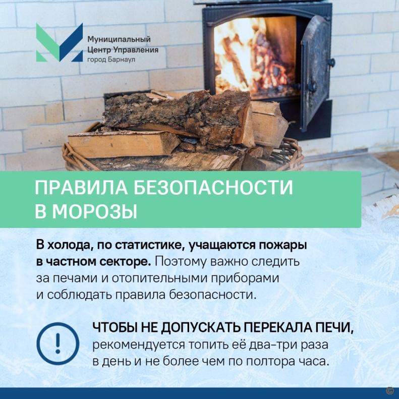 В связи с тем, что на территории Алтайского края в период с 14 по 20 января прогнозируется экстремально холодная погода (минимальная температура составит −35 °C и ниже, а в отдельных районах столбики термометров опустятся до −40 °C и ниже) на территории города усилена профилактическая работа с населением по обеспечению соблюдения правил пожарной безопасности.